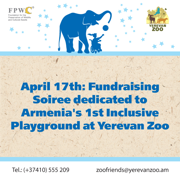 On April 17, FPWC will be hosting a Fundraising Soiree to raise funds to build Armenia's 1st inclusive playground at the Yerevan Zoo. The ambitious initiative aims to provide a unique inclusive space for thousands of disabled children in the country who face public segregation. The event will be comprised of dinner, live music and inclusive dance and theater performances, including an act by NCA.Small Theater and a performance by the Paros Chamber Choir – a project of Unison NGO. Tickets can be purchased by emailing zoofriends@yerevanzoo.am or calling 093 179 023. The deadline for reservations is April 15.